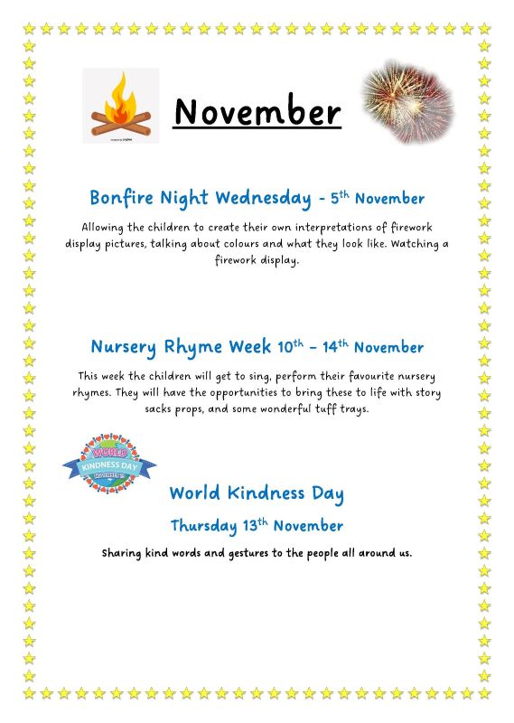 Rugby Prepcare Day Nursery Diary of Events 2025 Click Here To Download Our Diary Events MayMonday 12th Mental Health Awareness WeekFurther details to be released nearer the time. Monday 19th Walk to School & Nursery WeekWe are encouraging children to take part in a sponsored walk to nursery this week, the money will be raised for a charity, if there is a charity that is close to your heart you would like to nominate, please let us know sponsor forms will be handed out nearer the time. Thursday 22nd Outdoor classroom dayThis is a day dedicated to exploring the outdoors with various activities such as making bird food, making bug hotels, painting stones, leaf rubbing and lots lots more. Parents will be invited in to explore with their little ones and join in the activities. Wednesday 21st – Babies 9:30am-10:30amThursday 22nd – Tweenies 9:30am-10:30amFriday 23rd – Pre-School 9:30am-10:30am